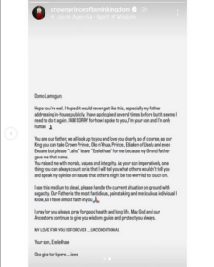 “I use this medium to plead. Please handle the current situation on the ground with sagacity. Our father is the most fastidious, painstaking, and meticulous individual I know, so I have faith in you,” the Crown Prince said.