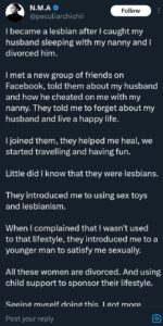 I became a lesbian after I caught my husband sleeping with my nanny and I divorced him.