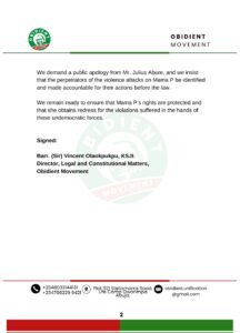 The attention of the OBIDIENT MOVEMENT has been brought to a now viral video shared across various platforms on social media of the brutal attacks and assault on Ms. Precious Oruche (Mama P).The incident, which left her beaten and visibly distressed is nothing short of degrading, inhumane, and a direct violation of her constitutional right to dignity as guaranteed under section 34 of the Constitution of the Federal Republic of Nigeria 1999 (as amended). Nobody, whether suspected of commission of an offence or entirely innocent, deserves to be subjected to such barbaric treatment.